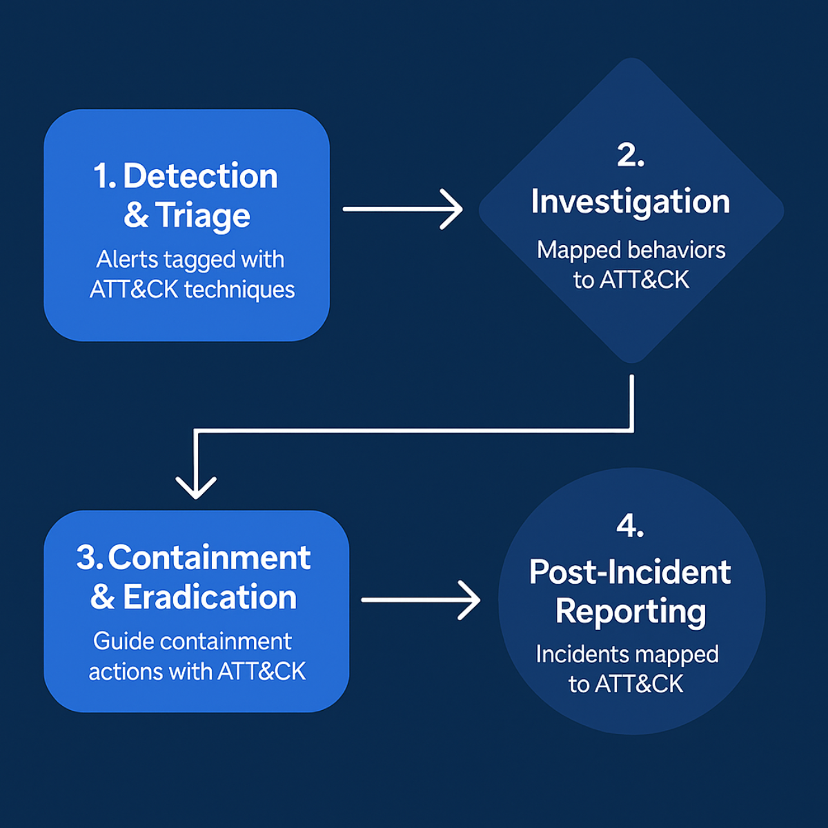 When an incident occurs, time is critical. The ATT&CK Framework gives responders a structured way to map out what has already happened, what the attacker’s next move might be, and where to look for evidence. Each phase of response benefits from ATT&CK alignment: