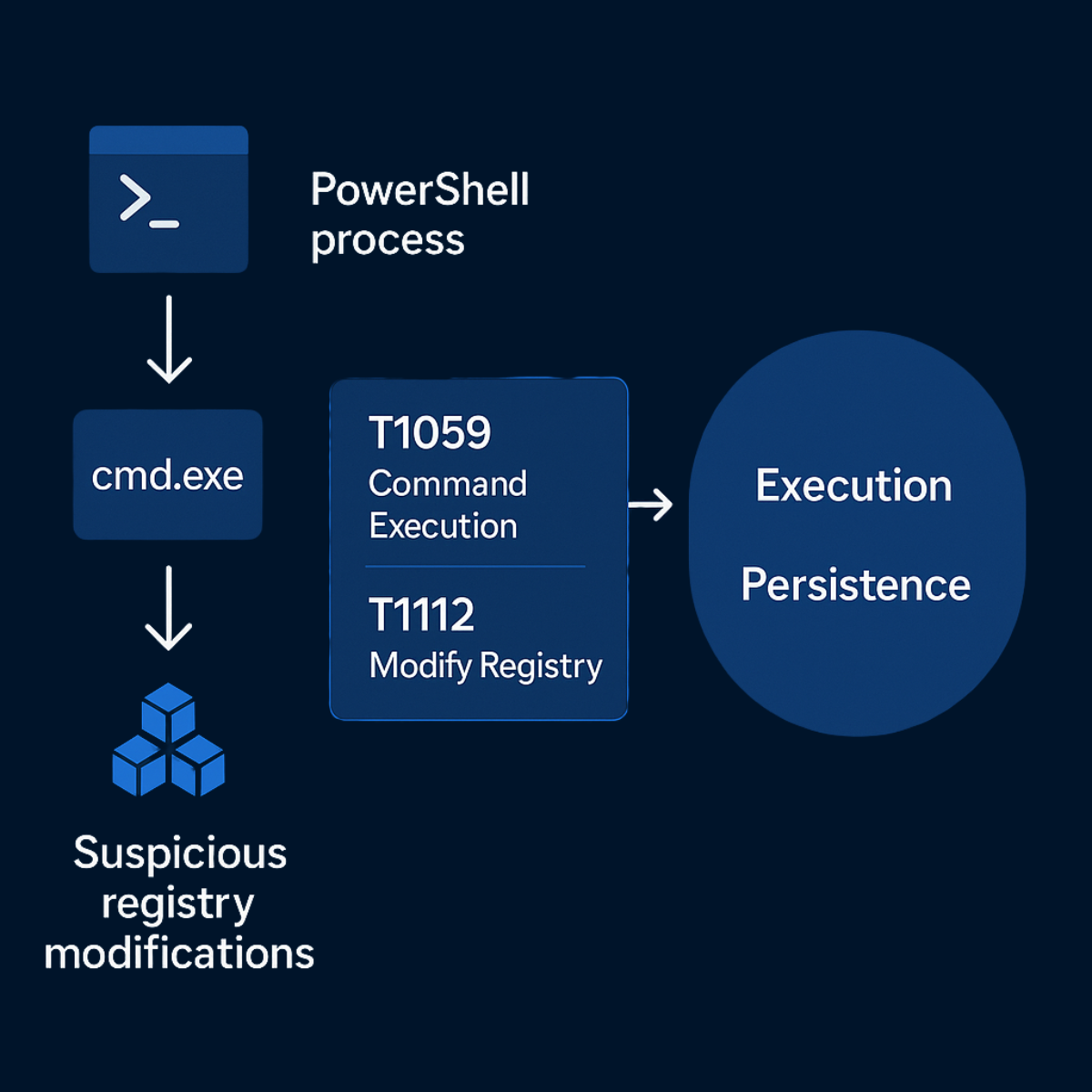 Imagine an analyst observes a PowerShell process spawning cmd.exe followed by suspicious registry modifications. Using ATT&CK, they can immediately identify these behaviors as T1059 (Command Execution) and T1112 (Modify Registry). This mapping provides instant insight into the adversary’s tactics — in this case, Execution and Persistence — and guides the next investigative steps, such as checking for lateral movement or persistence mechanisms.