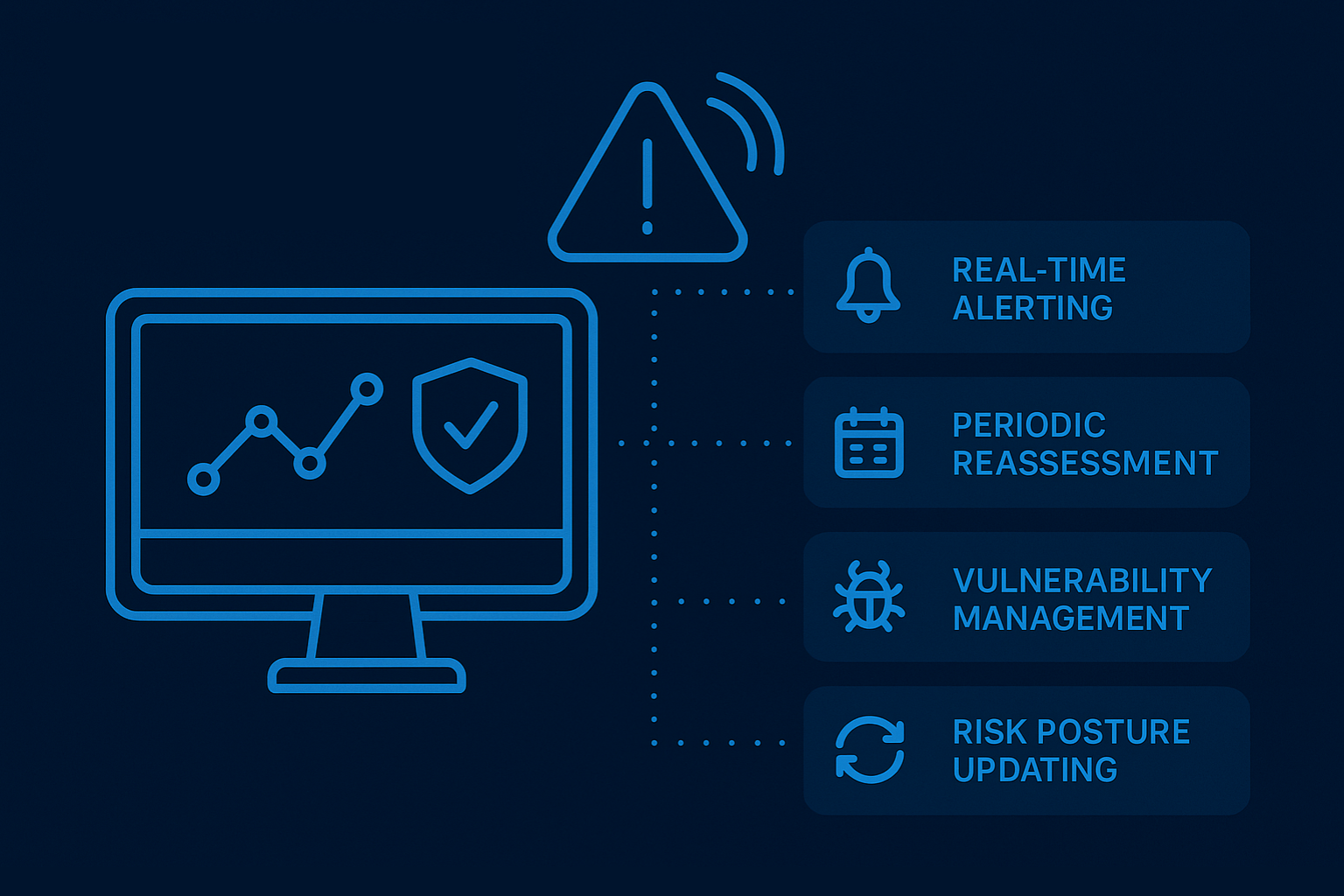 Continuous monitoring ensures that controls remain effective as threats evolve. This includes real-time alerting, periodic reassessment, vulnerability management, and updating the risk posture.