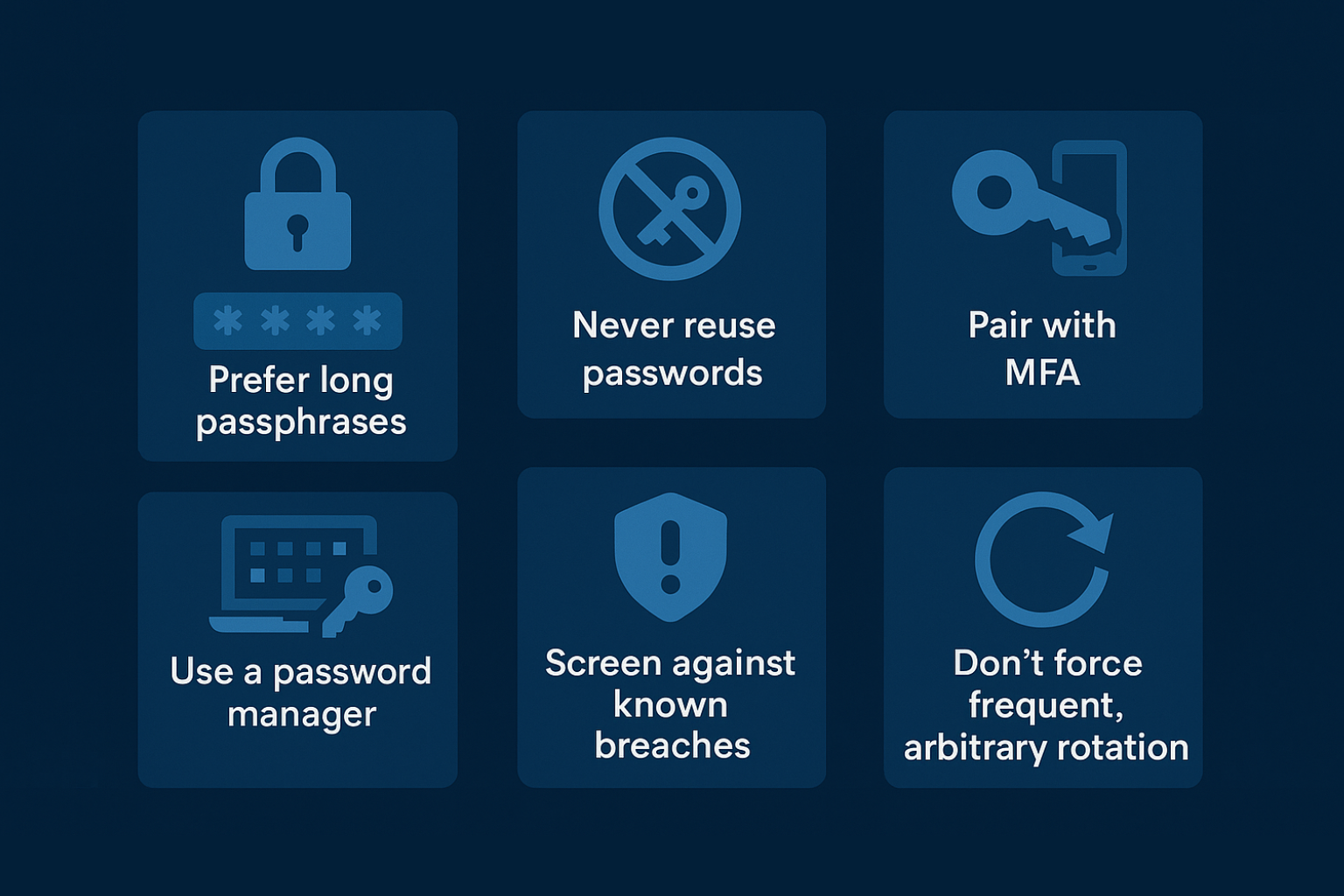 - Ban common patterns: No personal info, seasons+year (“Summer2025!”), keyboard walks (“qwertyui”).